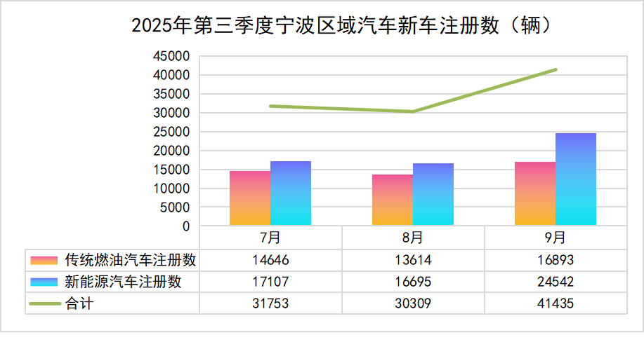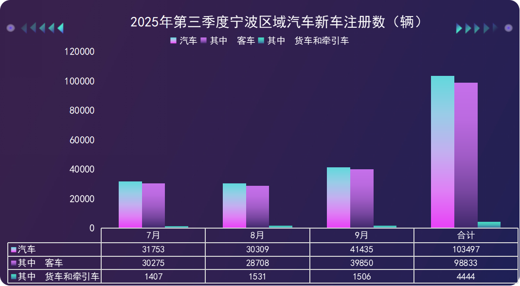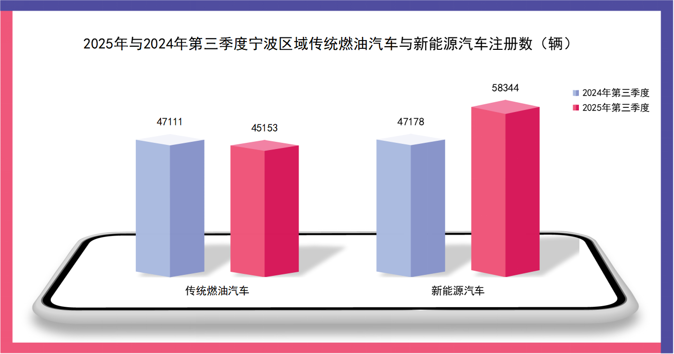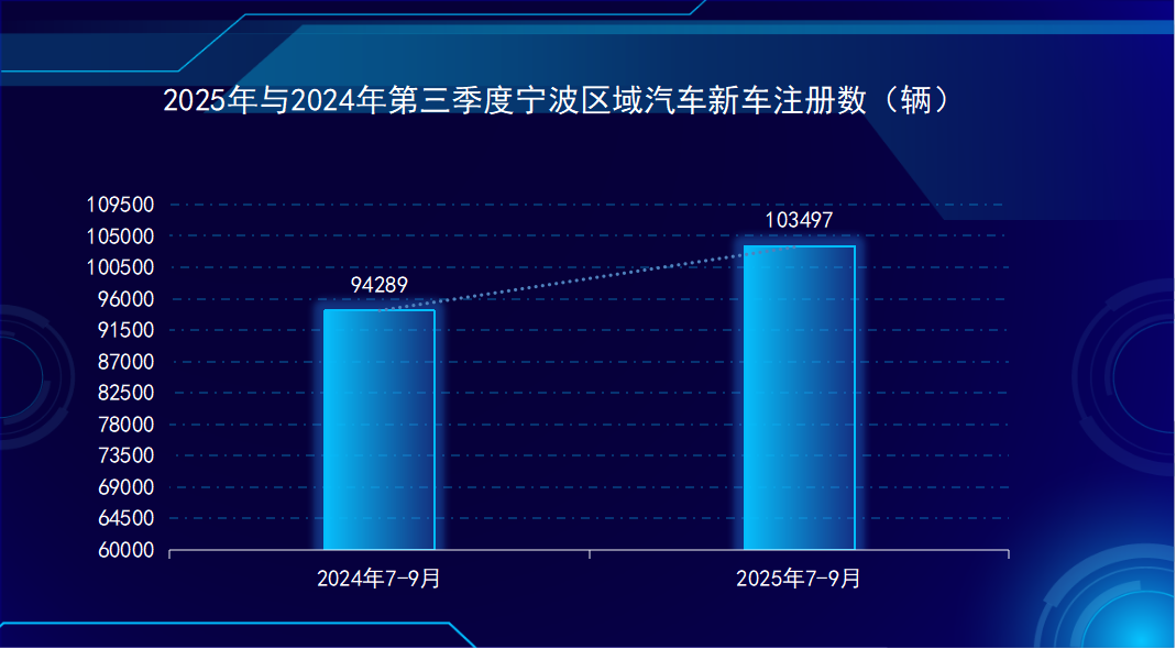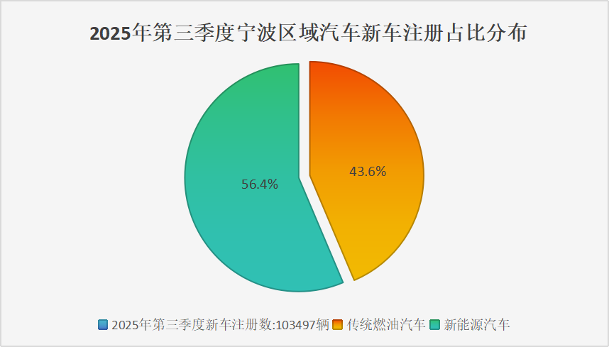 2025年第三季度宁波区域新车注册数103497辆,其中,传统燃油汽车新车注册数45153辆;新能源汽车新车注册数58344辆。