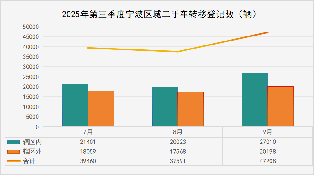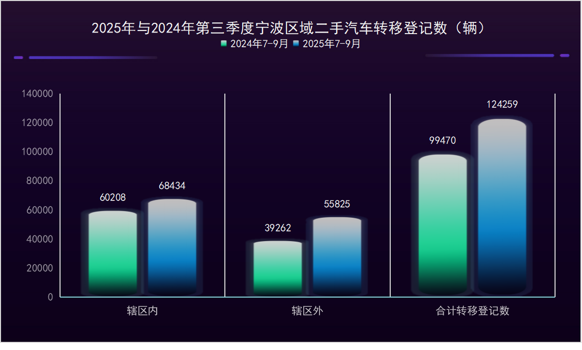 2025年第三季度宁波区域二手汽车转移登记124259辆,较第二季度104981辆环比增长18.36%,与2024年第三季度99470辆同比增长24.92%,市场交易创下同期新高。其中,辖区内转移登记同比增长13.66%;辖区外转移登记同比增长42.18%。随着二手车市场流通环境的持续优化,辖区外转移登记增速显著,跨区域流通成为拉动市场增长的主要引擎。