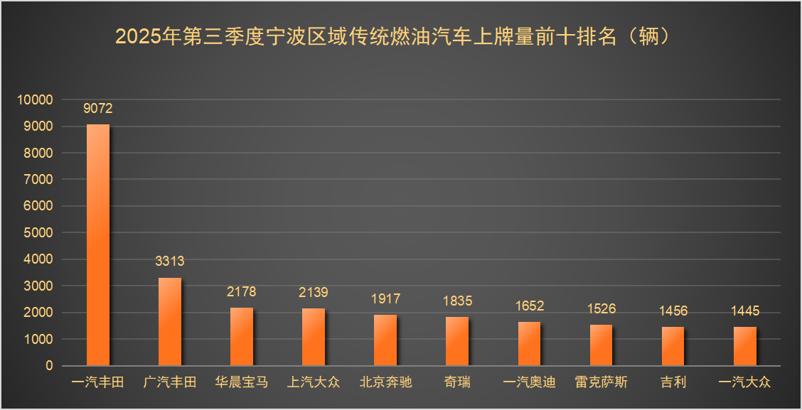 第三季度全市传统燃油车市场,头部品牌格局稳定。一汽丰田以9072辆的上牌量稳居榜首,广汽丰田以3313辆的上牌量位列第2名,华晨宝马以2178辆的上牌量位列第3名,显示出成熟品牌在细分市场中仍具竞争优势。全市传统燃油车前十名上牌量榜单: